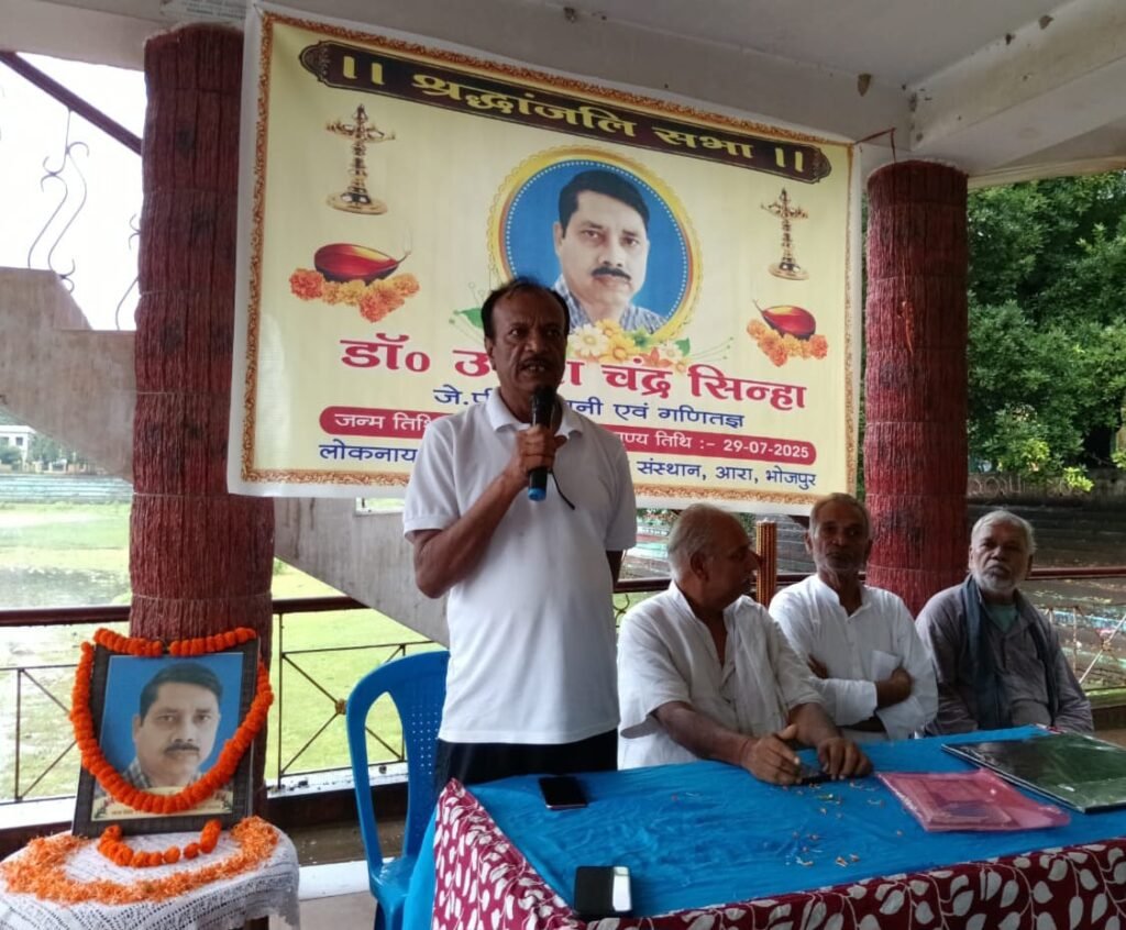 सभा की अध्यक्षता वरिष्ठ जे. पी. सेनानी सुशील तिवारी ने और संचालन महासचिव सुशील कुमार ने किया. उमेश जी 1974 के आंदोलन के जुझारू कार्यकर्त्ता और सुप्रसिद्ध गणितज्ञ थे. विगत 29 जुलाई को ह्रदय गति रुक जाने के कारण दिल्ली में उनका निधन हो गया. उमेश जी वीर कुंवर सिंह विश्वविद्यालय के पूर्व कुलपति के. सी. सिन्हा के छोटे भाई थे. जे. पी आंदोलन के साथ – साथ आरा, पटना, नागपुर में छात्र-युवा संघर्ष वाहिनी के पूर्णकलिक कार्यकर्त्ता के रूप में वर्षों तक सक्रिय भूमिका निभाते रहे थे. बोध गया भूमि आंदोलन में उमेश जी की अग्रणी भूमिका रही थी. उस आंदोलन में भी वो गया जेल में रहे थे.