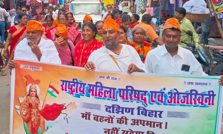 राष्ट्रीय महिला परिषद एवं ओजस्विनी भोजपुर, आरा की बैनर तले पदयात्रा निकाली गई भारत देश के प्रधानमंत्री माननीय श्री नरेन्द्र भाई मोदी की मां के ऊपर अभद्र भाषाओं का प्रयोग गलत है जो इस दुनिया में नहीं है या है भी तो महिलाओं बहनों पर अभद्रता की वाक्य सही नहीं है सो बहुत हुआ अब नहीं सहेगी महिला समाज , मां बहनों की अपमान नहीं सहेगा हिंदुस्तान ।ये तो एक झांकी है, शेष कार्य बाकी है। लव ए जिहाद पर रोक लगाओ । नारी ही .. दुर्गा,लक्ष्मी,काली है। इन वाक्य पर ध्यान कोई नहीं करेगा तो जन आंदोलन सारी महिला समाज करेगी। अंतरराष्ट्रीय हिन्दू परिषद राष्ट्रीय बजरंग दल आगे चलकर इस आंदोलन में उग्र रूप धारण करेगा चाहे सत्ताधारी हो, विपक्षधारी हो। मां बहनों की करो सुरक्षा तब होगी राष्ट्र की शुभ निर्माण। नारी की रूप अनेक है दुर्गा रूप में पालन करती, लक्ष्मी रुप सम्पन्न परिवार होती, काली रूप में यह सांघार करती है।
