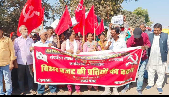 बिहार बजट 2025 का भाकपा-माले ने राज्यव्यापी तीन दिवसीय प्रतिरोध दिवस के तहत आज भाकपा-माले ने क्रांति पार्क से प्रतिवाद मार्च निकालकर बस स्टैंड आरा में बिहार बजट 2025 का प्रशन जलाकर विरुद्ध दर्ज किया इस दौरान लोगों ने के नीतीश कुमार-भाजपा के खिलाफ जमकर नारेबाजी की रिश्तेदार बस स्टैंड आरा में बिहार बजट 2025 की प्रशन जलाकर विरोध-प्रदर्शन किया!इस दौरान सभा को संबोधित करते हुए भाकपा-माले नेताओं ने कहा कि बिहार सरकार द्वारा पेश किए गए बजट में आशा,जीविका,रसोइया,आंगनवाड़ी, माइक्रोफाइनेंस कंपनियों से जुड़ी महिलाओं की कर्ज माफी,आउटसोर्सिंग पर काम कर रहे सफाईकर्मी,कार्यपालक सहायक और अन्य स्कीम वर्करों सहित ठेका पर काम कर रहे लाखों लोगों की लोकप्रिय मांगों को कोई जगह नहीं मिली है!