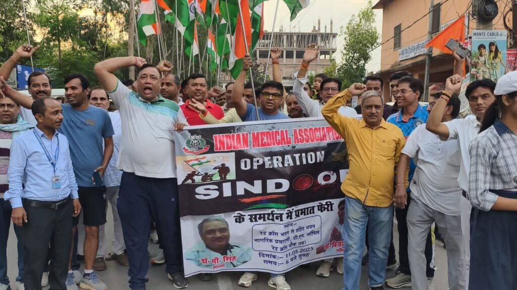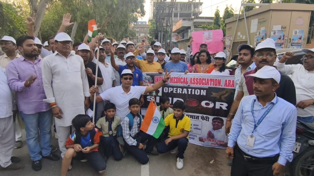 इंडियन मेडिकल एसोसिएशन आरा के द्वारा सुबह 6 बजे आरा के रेड क्रॉस सोसाइटी के पास से ऑपरेशन सिंदूर की सफलता एवं हमारे देश की सेना का शौर्य एवं पराक्रम के उत्साहवर्धन के लिए एक प्रभात फेरी का आयोजन किया गया । इस प्रभात फेरी में हमारे आरा के सम्मानित बुद्धिजीवी, सभी चिकित्सक, खिलाड़ी एवं आम राष्ट्रप्रेमी भी शामिल हुए ।