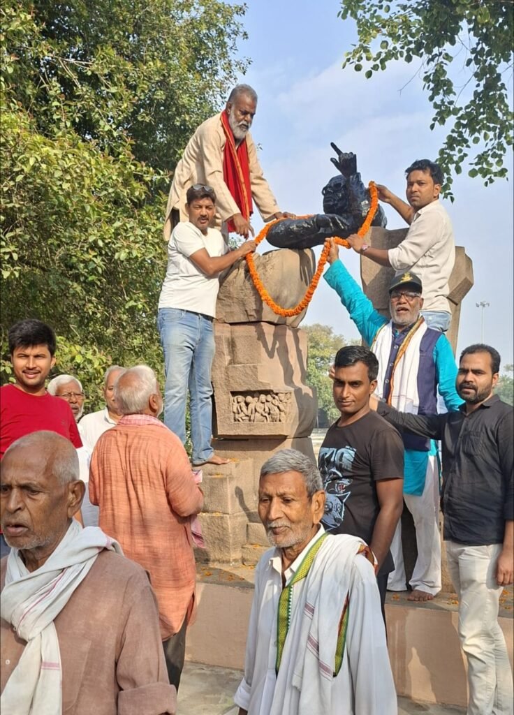 ठीक सुबह 7 बजे सबसे पहले माल्यार्पण पूर्व विधायक व जे पी सेनानी रमाकांत ठाकुर, सुशील तिवारी, गुलाब चंद प्रसाद, बैजनाथ पासवान ने सामूहिक रूप से अपने नायक की मूर्ति पर माल्यार्पण किया।उस वक्त उपस्थित लोगों ने जोड़दार नारा लगाए।