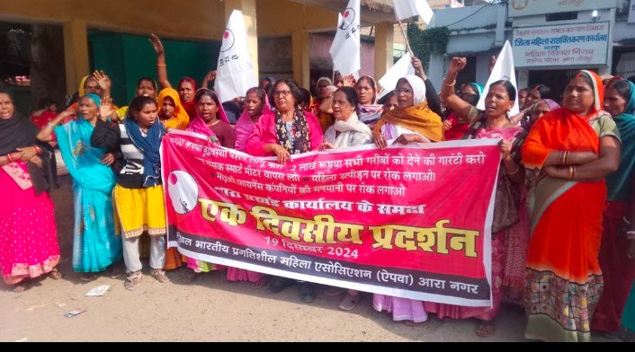 ऐपवा नगर कमेटी की ओर से आरा प्रखंड कार्यालय के समक्ष प्रदर्शन किया गया!यह प्रदर्शन खून चूसक स्मार्ट मीटर वापस लेने,सभी वृद्धावस्था पेंशन हर महीने 3 हजार रुपए देने,सभी गरीबों को 2 लाख रु.देने की गारंटी करने,अतिक्रमण के नाम पर गरीब के झोपड़ियों को उजाड़ना बंद करने,उजाड़ने से पहले बसाने की व्यवस्था करने,माइक्रो फाइनेंस कंपनियों की मनमानी पर रोक लगाने,बलात्कार-अत्याचार रोकने के लिए पुलिस प्रशासन को जवाबदेह बनाने,