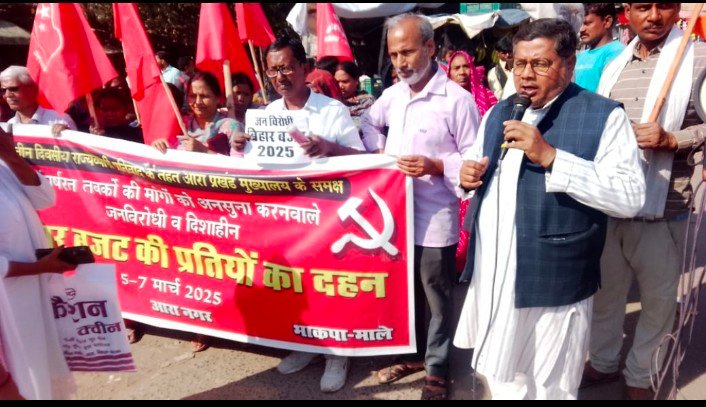 बिहार बजट के खिलाफ भाकपा-माले ने राज्यव्यापी आह्वान के तहत आरा में बिहार बजट का पुतला जलाया बिहार बजट 2025...